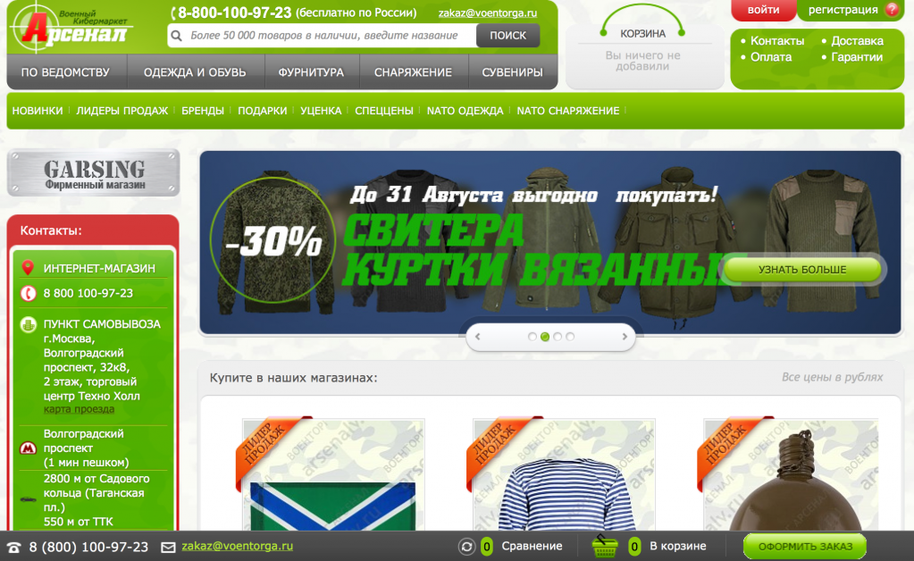 Ассортимент магазина насчитывает более 50 тысяч позиций, включая одежду и обувь, фурнитуру, снаряжение и сувениры. Чтобы сайтом «Арсенала» было удобно пользоваться, на нем должны были удобно располагаться все виды фильтров и каталогов, по которым было бы легко сориентироваться, — классификация по ведомству, категории товара, производителю, разделы со скидками и уценкой. Каждому пользователю нужно было также предоставить информацию о доставке, оптовых продажах, способах оплаты, графике работы. Удобство навигации и юзабилити напрямую определяло бизнес-процессы компании: чем проще клиенту совершить заказ через сайт, тем меньше ресурсов нужно будет потратить на обработку каждого заказа. Оптимизация и автоматизация работы онлайн-военторга была главной задачей при разработке интернет-представительства «Арсенала».