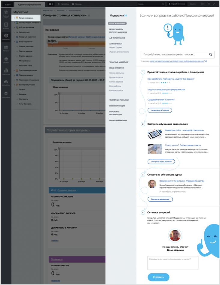 Теперь пользователи административного раздела сайта смогут находить ответы на свои вопросы без обращения в техподдержку. В новой версии платформы появляется Поддержка24, выполненная в формате статей, видео и обучающих курсов.