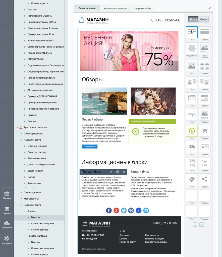 Блок инструментов для маркетологов в новой платформе для интернет-магазинов содержит «Товарный маркетинг». В нем собраны 25 шаблонов различных маркетинговых акций для клиентов. Маркетологам не нужно больше думать о технических аспектах настройки акций, что значительно сокращает время запуска.