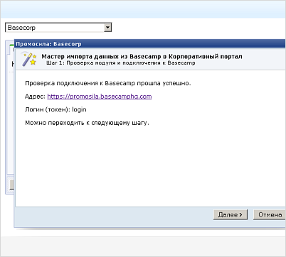 Импорт данных из Basecamp в Корпоративный портал. Импортировать из своего аккаунта Basecamp можно: пользователей, проекты, сообщения, списки задач и сами задачи, комментарии к сообщениям и задачам, события из календаря и другое. Все вновь импортируемые пользователи неактивны и не имеют доступа в интранет. Администратор должен проверить права и активировать пользователей вручную.