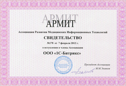 В феврале 2012 года компания «1С-Битрикс» вступила в Ассоциацию Развития Медицинских Информационных Технологий (АРМИТ), основная цель которой – обобщение опыта членов Ассоциации и координация их деятельности по созданию цивилизованного рынка медицинских информационных технологий (МИТ).