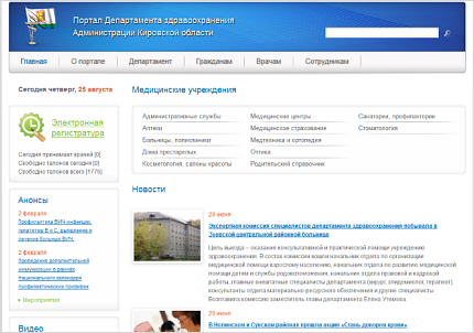 Портал в коробочной поставке имеет готовую структуру, учитывающую основные потребности органа управления здравоохранением. На главной странице размещается основная информация, новости, фото- и  видеогалерея. В разделе информации об органе управления здравоохранения хранится общая информация, информация о сотрудниках, блоги, библиотека документов. Есть отдельные разделы для граждан, где они могут воспользоваться услугами электронной регистратуры, общественной приемной и форумом, и врачей с необходимой для них информацией – новостями, мероприятиями, форумом. Предусмотрена возможность авторизации сотрудников. Система обладает широкими возможностями кастомизации в соответствии с требованиями конкретного медицинского учреждения.