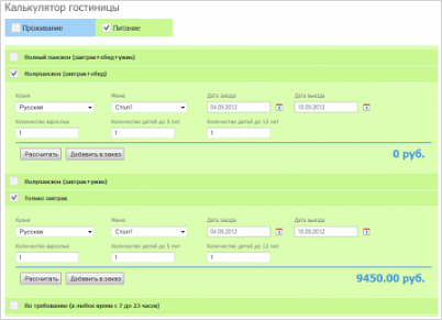 Калькулятор позволяет произвести расчет вариантов стоимости услуг для списка услуг, добавить понравившиеся варианты в заказ и отправить его. Если отправка заказа не нужна, эта опция может быть отключена, и тогда калькулятор рассчитывает только общую стоимость.