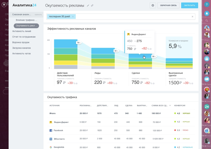 • Сквозная аналитика. Без интеграции и бесплатно на всех тарифах! Вы получите полный отчет: от привлечения потенциального клиента, работе с ним отдела продаж до финальной покупки, узнаете, какой трафик приносит вам продажи, сколько вы тратите на привлечение каждого покупателя и как ваши менеджеры работают с каждым каналом.