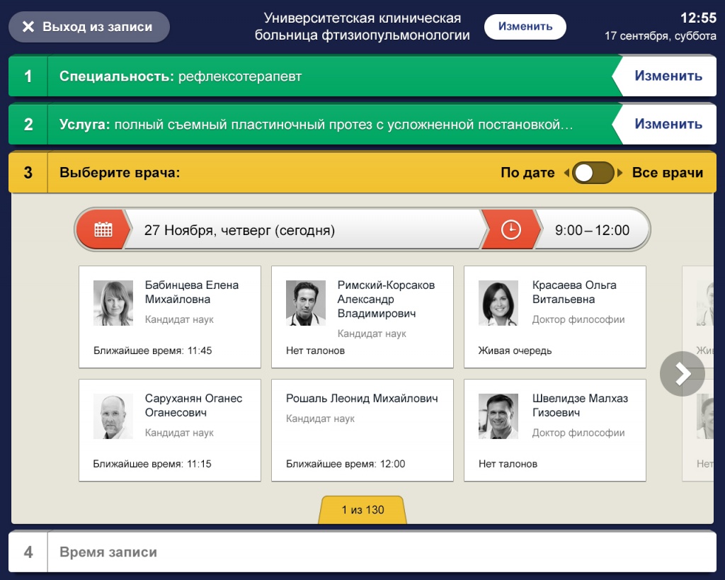 При записи по времени пользователь сначала выбирает дату и интервал, когда ему будет удобно посетить врача, после чего на экране инфомата отображаются врачи, которые принимают именно в это время.