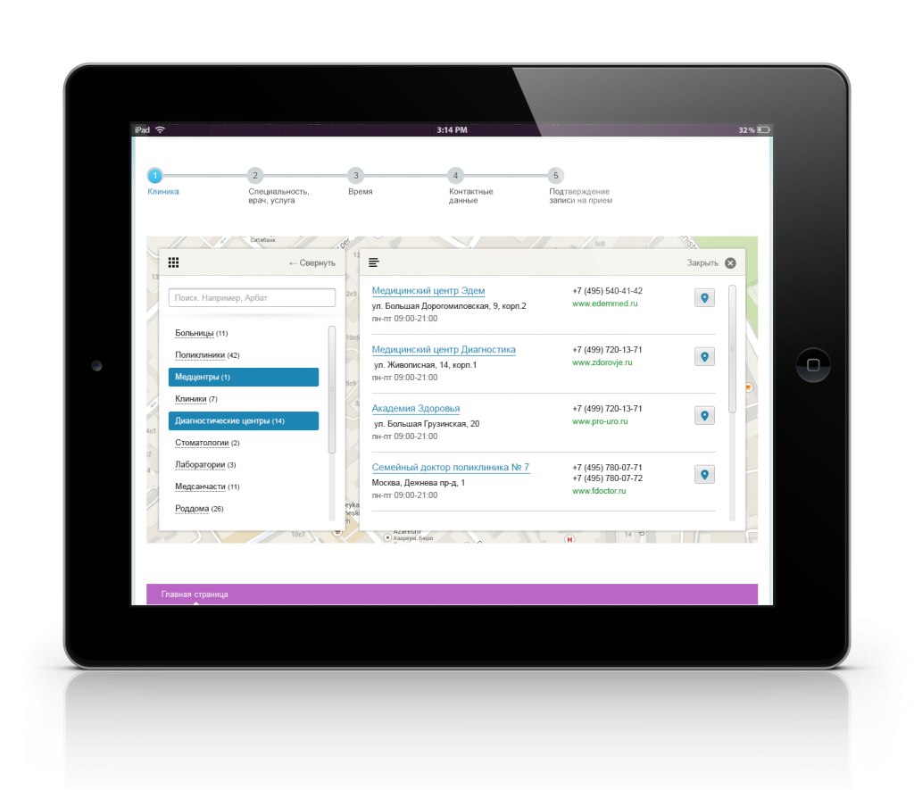 Пользователь выбирает клинику или отделение на интерактивной карте и может прямо с карты перейти в сервис записи на прием. Для удобства поиска клиник есть фильтр по названию.