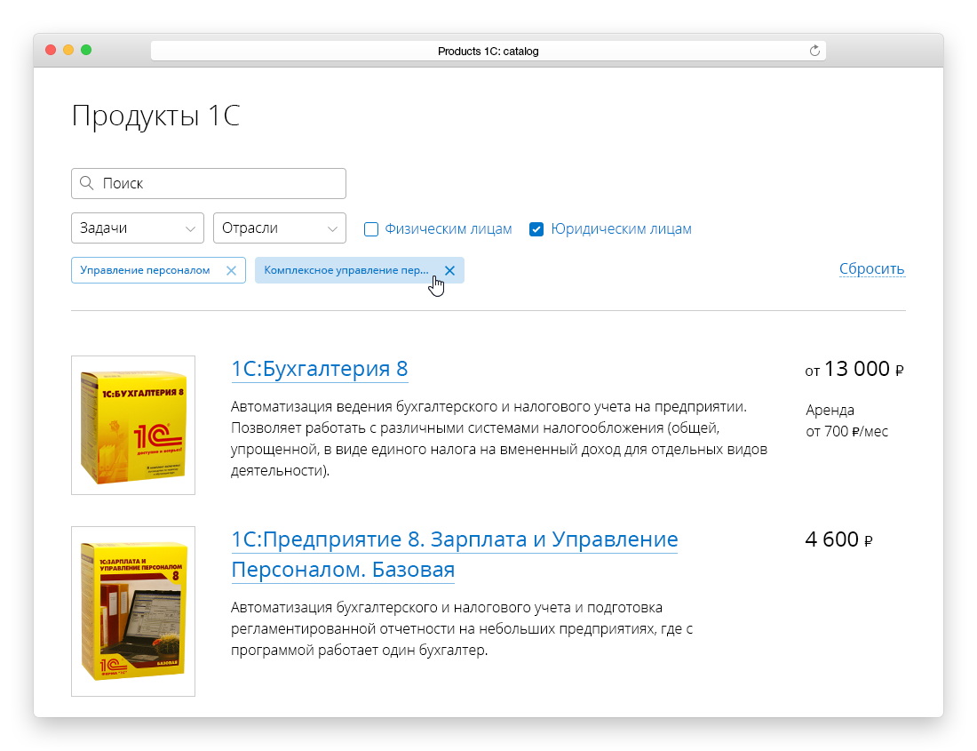 Есть несколько типов проектов: типовые отраслевые и крупные проекты с интеграциями с другими системами. Поэтому в каталоге программных продуктов мы предусмотрели фильтрацию по разным параметрам. Для удобства выбора продуктов каталог разделен на 3 группы продуктов: