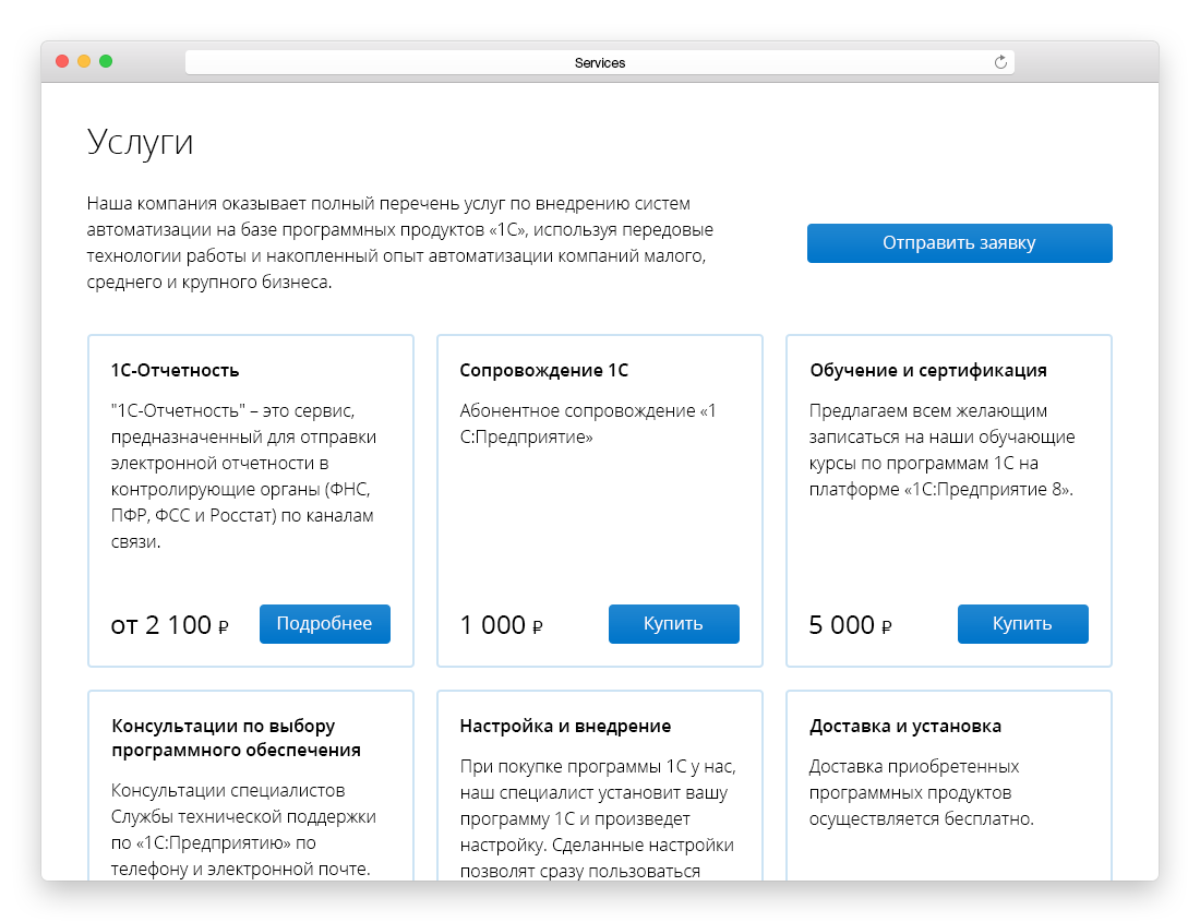 Внедрение продуктов «1С» - это комплексная услуга, состоящая из продажи продуктов «1С», их настройки и оказания услуг по поддержке и доработке под уникальные сценарии клиента. Для удобства каталог услуг разбит на 2 раздела:
