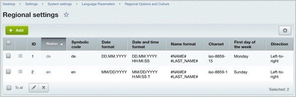 Откройте форму "Рабочий стол> Настройки > Настройки системы > Языковые параметры > Региональные настройки и культура" для добавления языковых параметров.