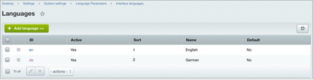 Например, для немецких языковых файлов сервер ожидает ID «de». Следовательно, перед загрузкой немецких языковых файлов необходимо создать язык с указанием ID «de».