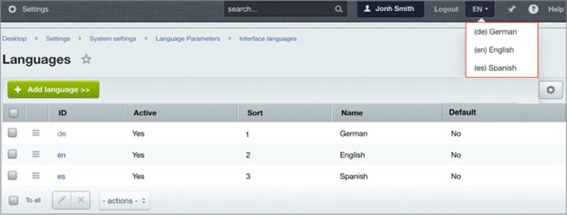 Перейдите к форме "Рабочий стол > Настройки > Настройки системы > Языковые параметры > Языки интерфейса" для добавления нового языкового профиля: